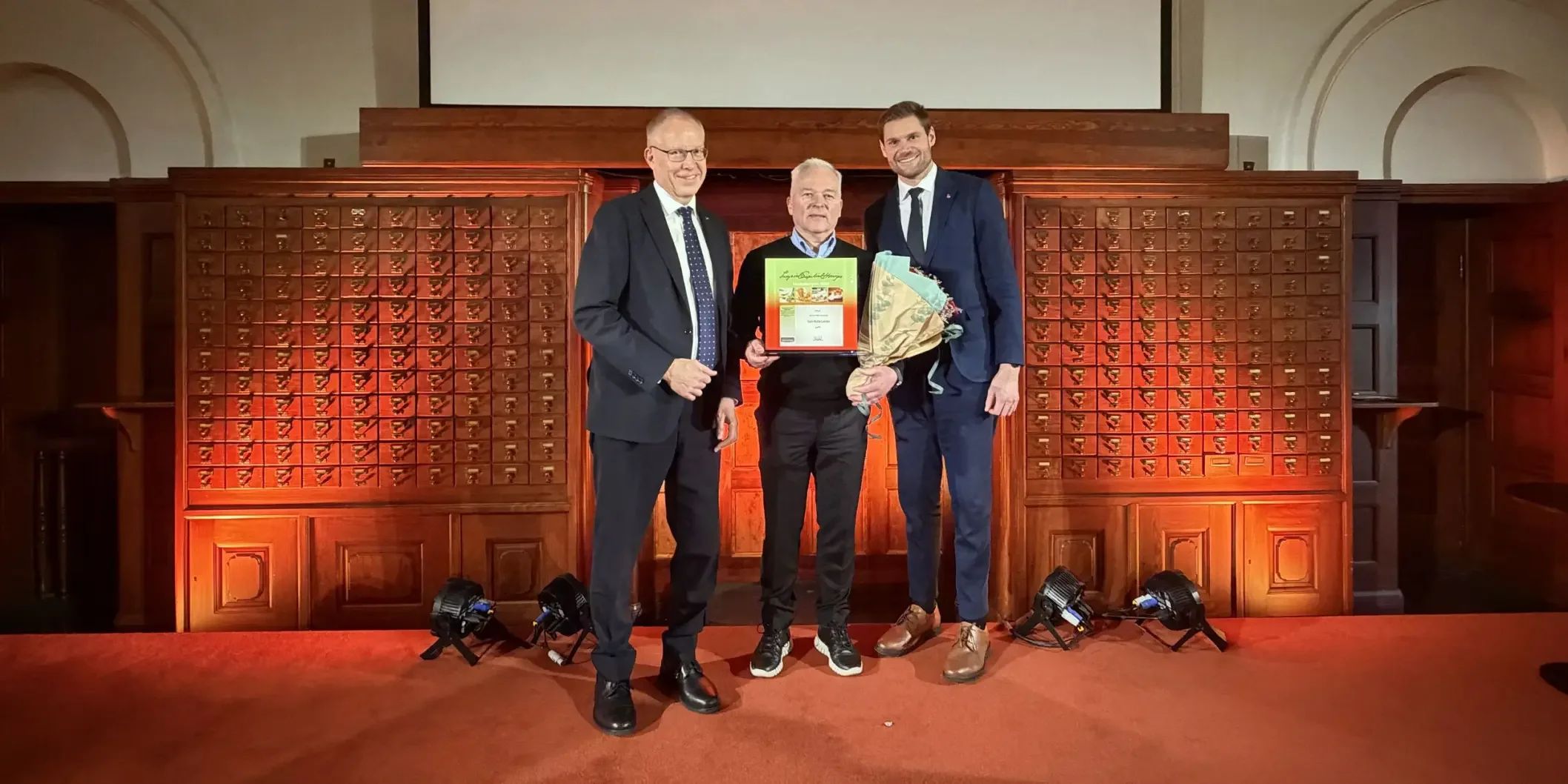 Geir Rune Larsen er avdelingsleder på Strinda vgs. og får prisen for sitt enestående arbeid innen rekruttering til restaurant- og matfag. Landbruks- og matminister Nils Kristen Sandtrøen delte ut prisen på Nasjonalbilioteket i Oslo.